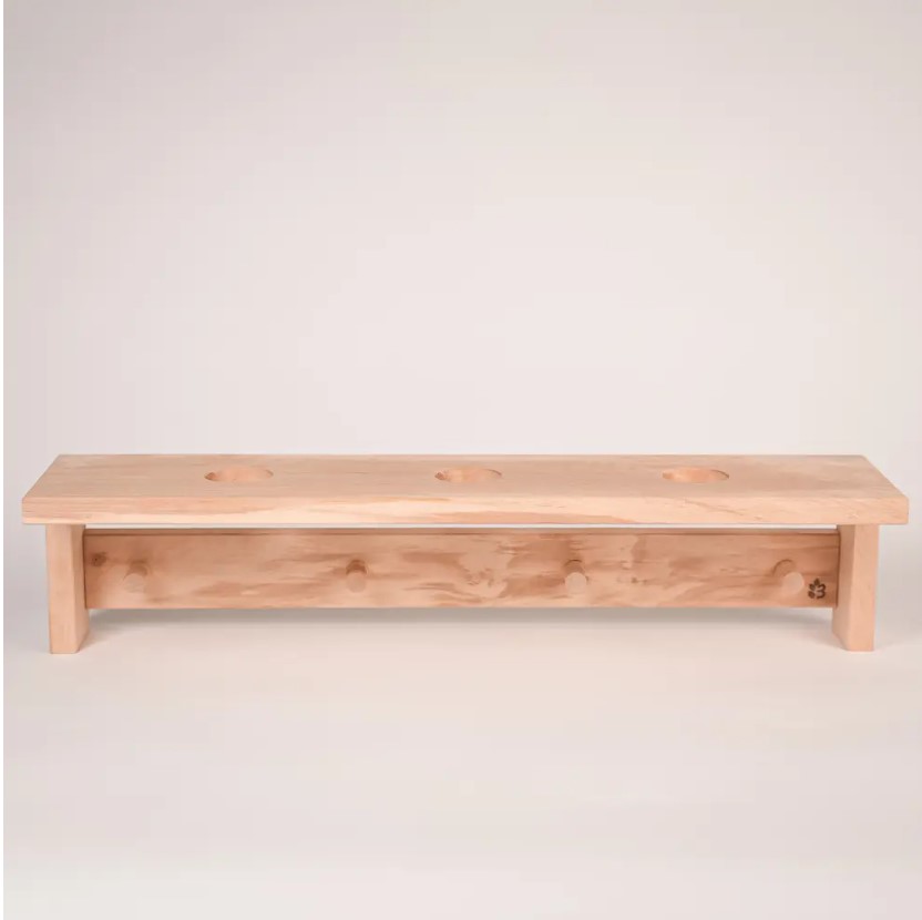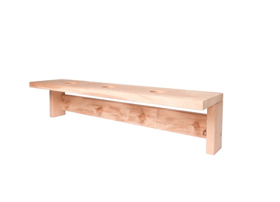 Полка для трав и веников на 3 отверстия и 4 крючка из массива Кавказской ольхи предназначена для дома, бани или влажных помещений. Для защиты древесины рекомендуется покрытием натуральным маслом после установки